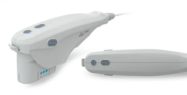 O handpiece é colocada suavemente sobre a pele e uma imagem do tecido abaixo é projetada em uma tela. Isso permite que o médico “veja” onde irá tratar a pele do paciente.