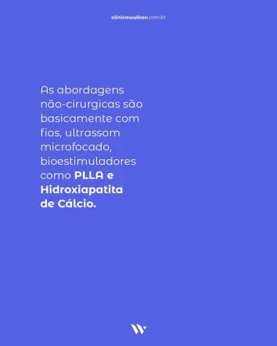 As abordagens não-cirurgicas são basicamente com fios, ultrassom microfocado, bioestimuladores como Radiesse e Sculptra, e os Skinbooster. Os lasers para estruturação profunda não funcionam bem na região do pescoço.